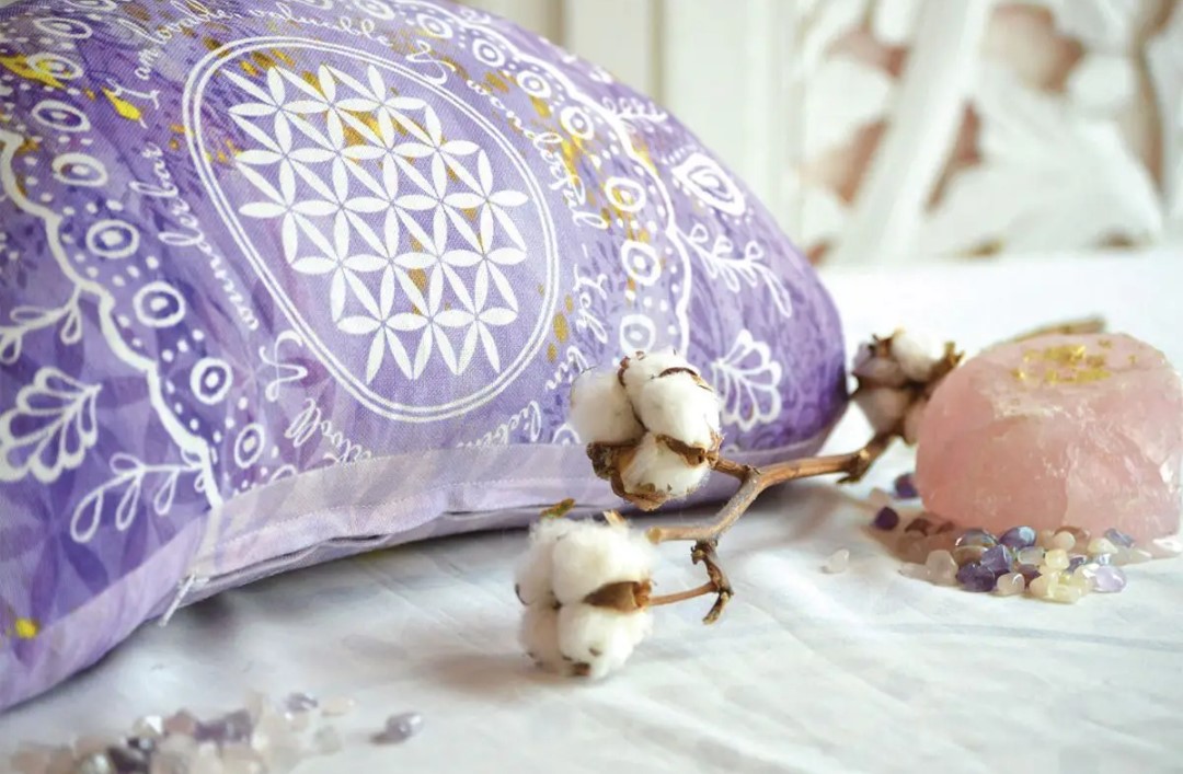 In den Digitaldruck des Kissens ist mikrofeiner Rosenquarz integriert, und tastbare Rosenquarz- und Amethyst-Edelsteine sind in das Trageband eingenäht. Diese Edelsteine fördern die Öffnung des Herzens und steigern den inneren Energiefluss, unterstützen die emotionale Heilung und erhöhen die geistige Klarheit während der Meditation.