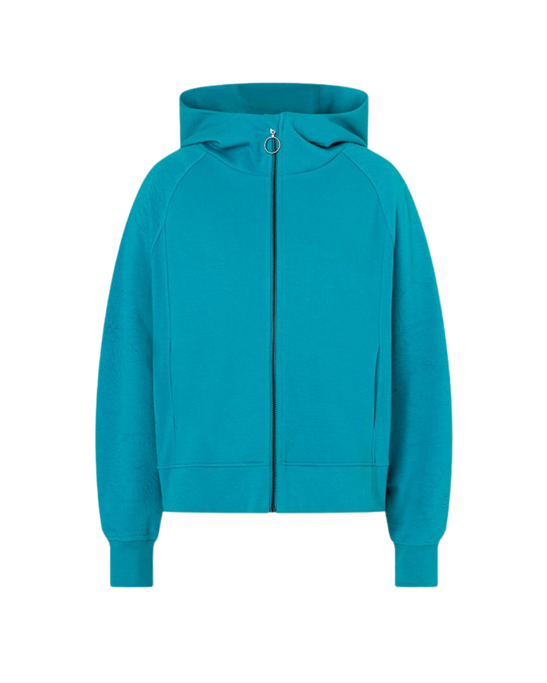 Die Raglan-Ärmel sorgen für Bewegungsfreiheit und einen angenehmen Sitz. Der sportliche Schnitt wird durch die weich fallende Kapuze und den durchgehenden Reißverschluss ergänzt.