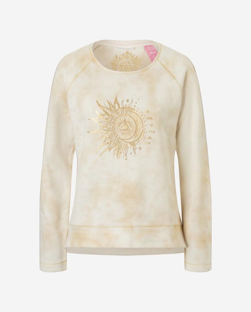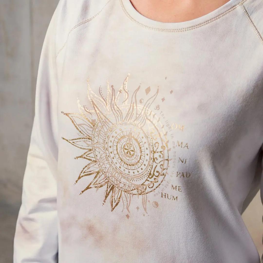 Dieser Sweaty zeichnet sich durch einen exklusiven Gold-Print und eine sorgfältig ausgeführte Hand-Batik aus, die jedes Stück zu einem Kunstwerk machen. Die sanften Farben und das einzigartige Muster verleihen ihm einen besonders edlen Touch, der in jeder Umgebung stilvoll wirkt.