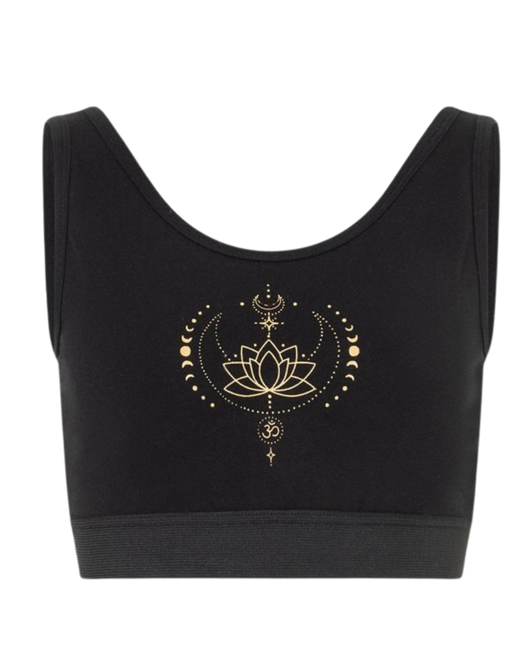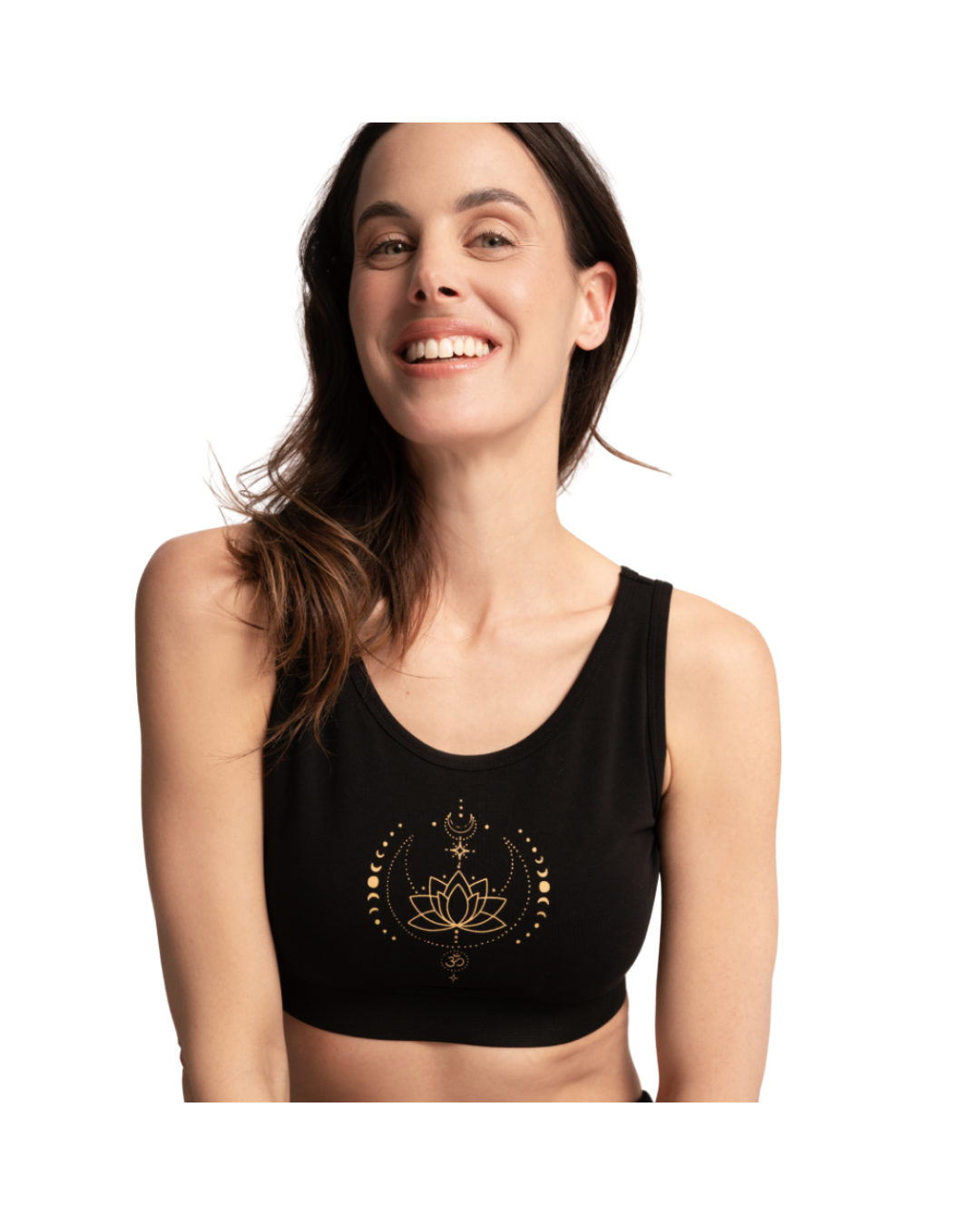 Der dezente Goldprint „Eka Padma“ auf der Brust setzt einen eleganten Akzent, ohne den minimalistischen Look zu unterbrechen. Dadurch lässt sich der Bra vielseitig kombinieren – als Teil eines Yoga-Outfits, unter lockeren Shirts oder als bequemes Basic für den Alltag.