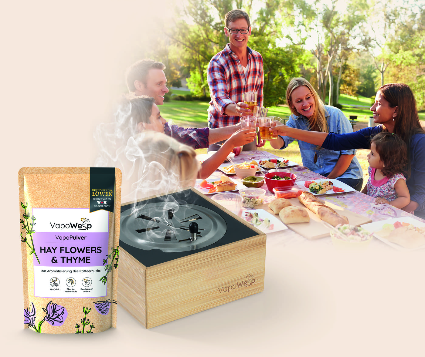 Durch die speziellen, natürlich duftenden VapoWesp Kräutermischungen wird das glimmende Kaffeepulver, welches normalerweise nach einiger Zeit unangenehm riecht, angenehm aromatisiert. So kannst du die Zeit im Freien entspannt genießen - mit zartem Räucher-Kräuterduft in der Nase!
