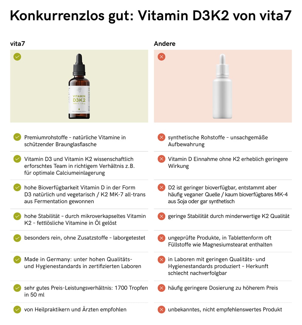 Die fettlöslichen Vitamine D3 und K2 sind bei vita7 in einem genau abgestimmten Verhältnis zueinander in MCT Kokosöl gelöst und gemischt. Das Vitamin D3K2 Verhältnis ist entscheidend für die Dosierung. Die flüssige und ölige Form sorgt für  eine hohe Stabilität und optimale Bioverfügbarkeit.